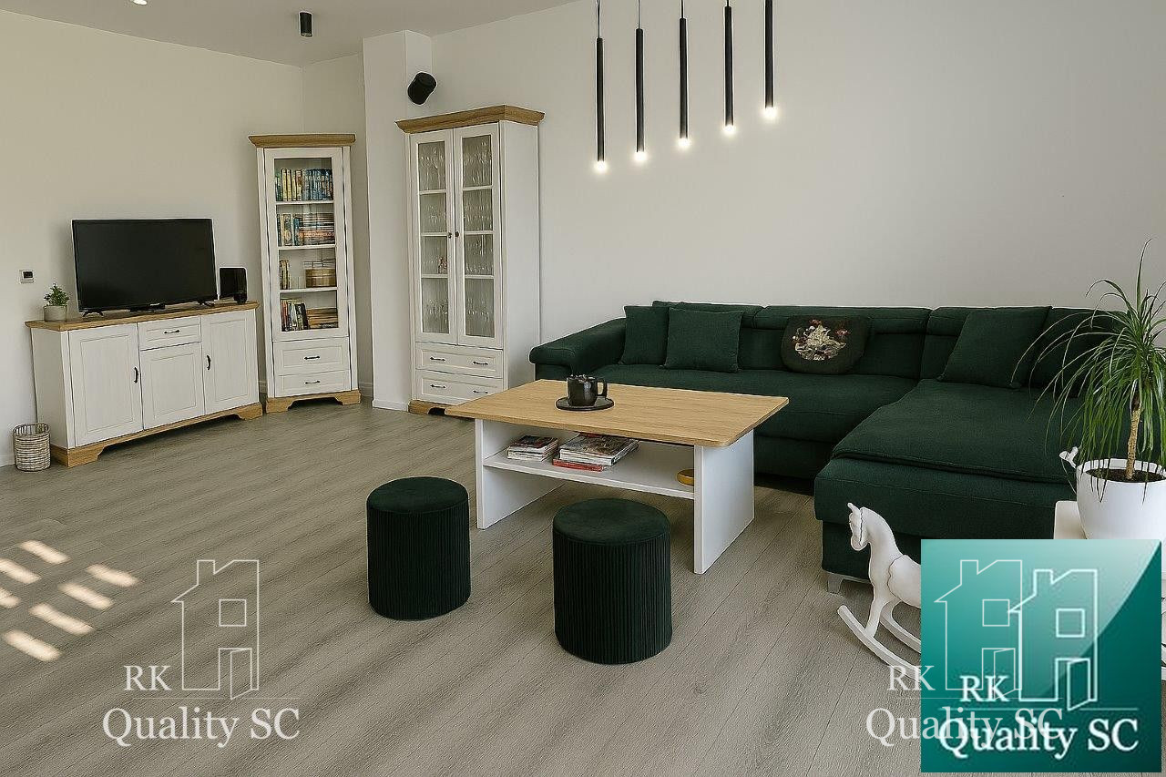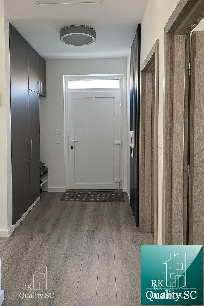 Dispozícia bytu: predsieň, po ľavej strane sú dve izby, samostatné WC, po pravej strane sa nachádza priestranná kúpeľňa s vaňou, technická miestnosť, prechod do jedálenskej časti s kuchyňou a priestrannou obývačkou, z ktorej sa vychádza na zastrešenú terasu (cca 21 m2). Dom je postavený z tehly, kompletne zateplený. Kúrenie elektrické podlahové. Predpríprava na klímu. K bytu prislúchajú dve parkovacie státia (vrámci pozemku) a jedno parkovacie státie vonku pred bránou.