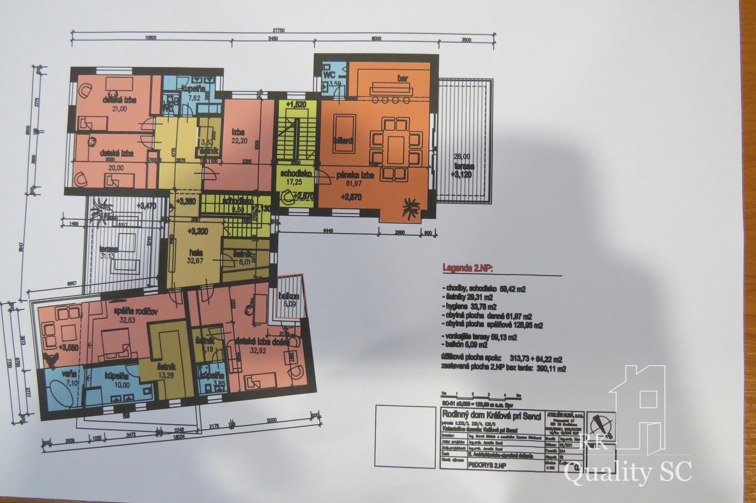 RK Quality SC Vám prináša ponuku na predaj: rozostavaný nadštandardný dvojpodlažný rodinný dom, ktorý sa nachádza v tichej lokalite v centre obce. Nachádza sa na rovinatom pozemku s celkovou plochou 2340 m2, z toho zastavaná plocha objektu 415 m2, úžitková plocha celého objektu je 716 m2.