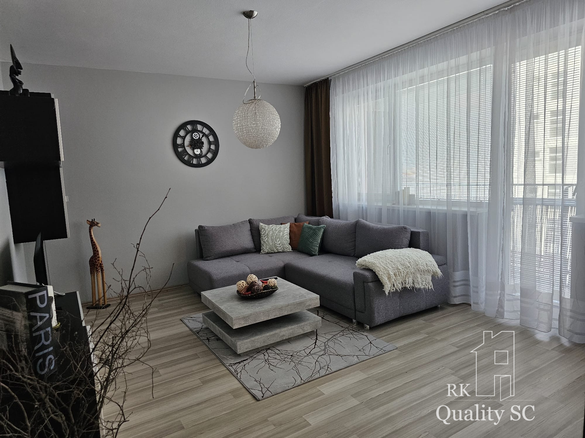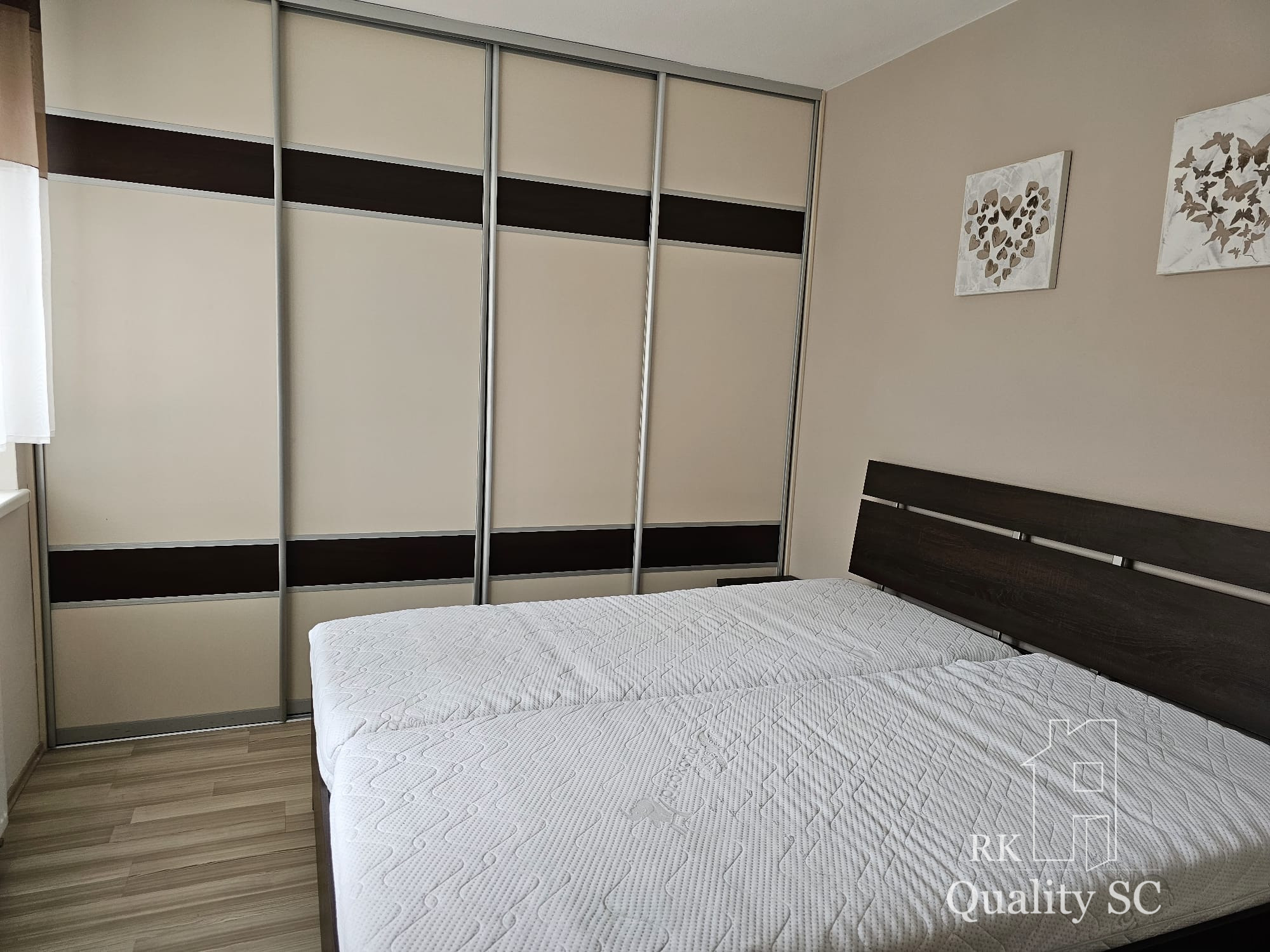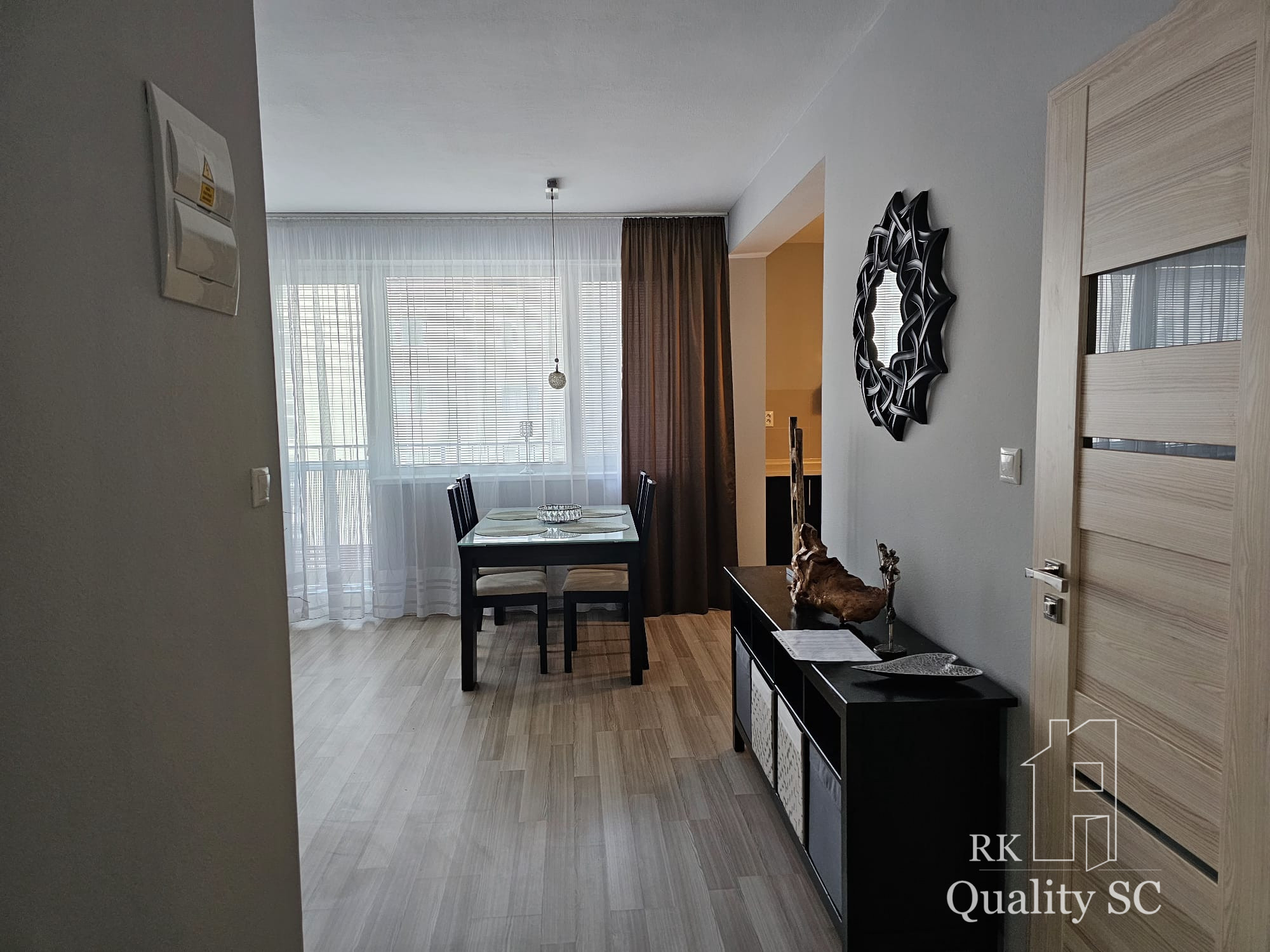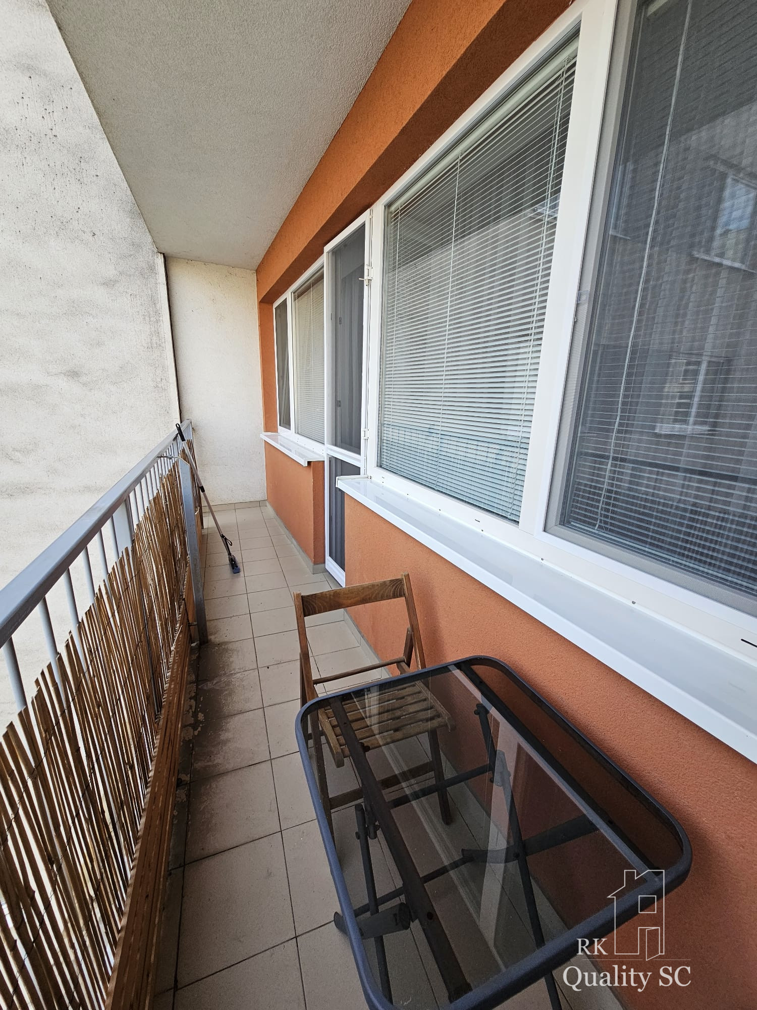 Popis bytu: vstupná chodba so vstavanou zrkadlovou rolldor skriňou, samostatná spálňa s manželskou posteľou + matrace , a vstavaná rolldor skriňa. Na chodbe komoda. Obývacia izba prepojená s kuchyňou. V obývacej časti je sedačka , komoda pod TV, Smart TV stolík, a závesná skrinka 2x. Vstup na loggiu je z obývacej izby . Na loggiu malý stolík + 2 stoličky. V kuchyni je kuchynská linka na mieru , sklo keramická varná doska , digestor, zabudovaná rúra, mikrovlnka , chladnička s mrazničkou. Kúpeľňa s vaňou a toaletou , práčka .