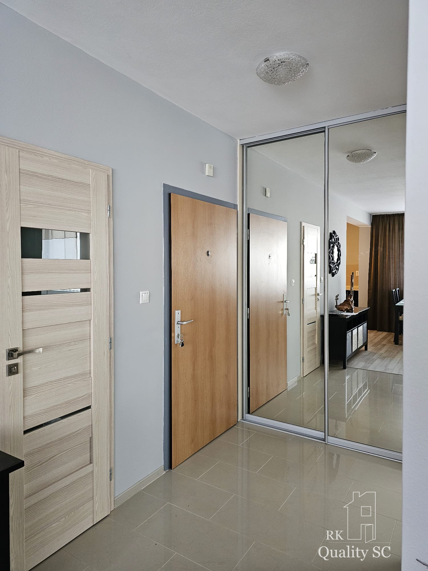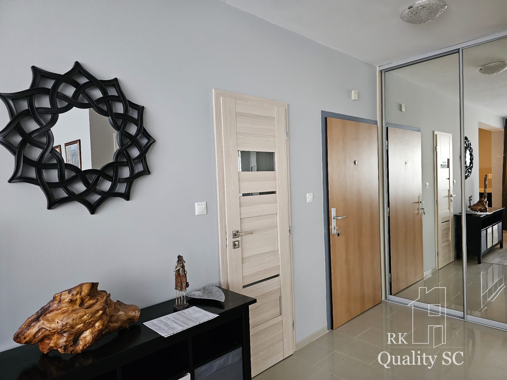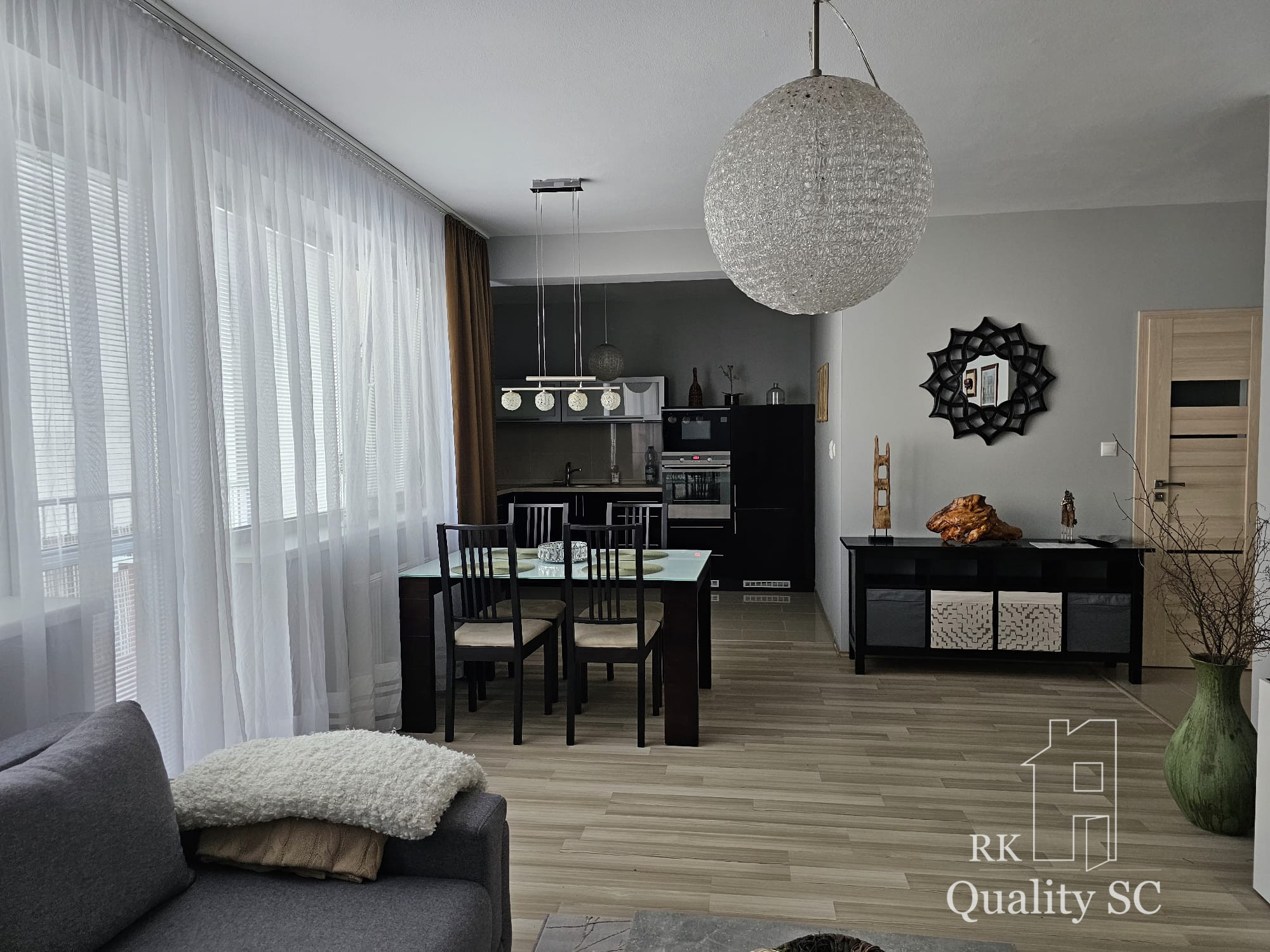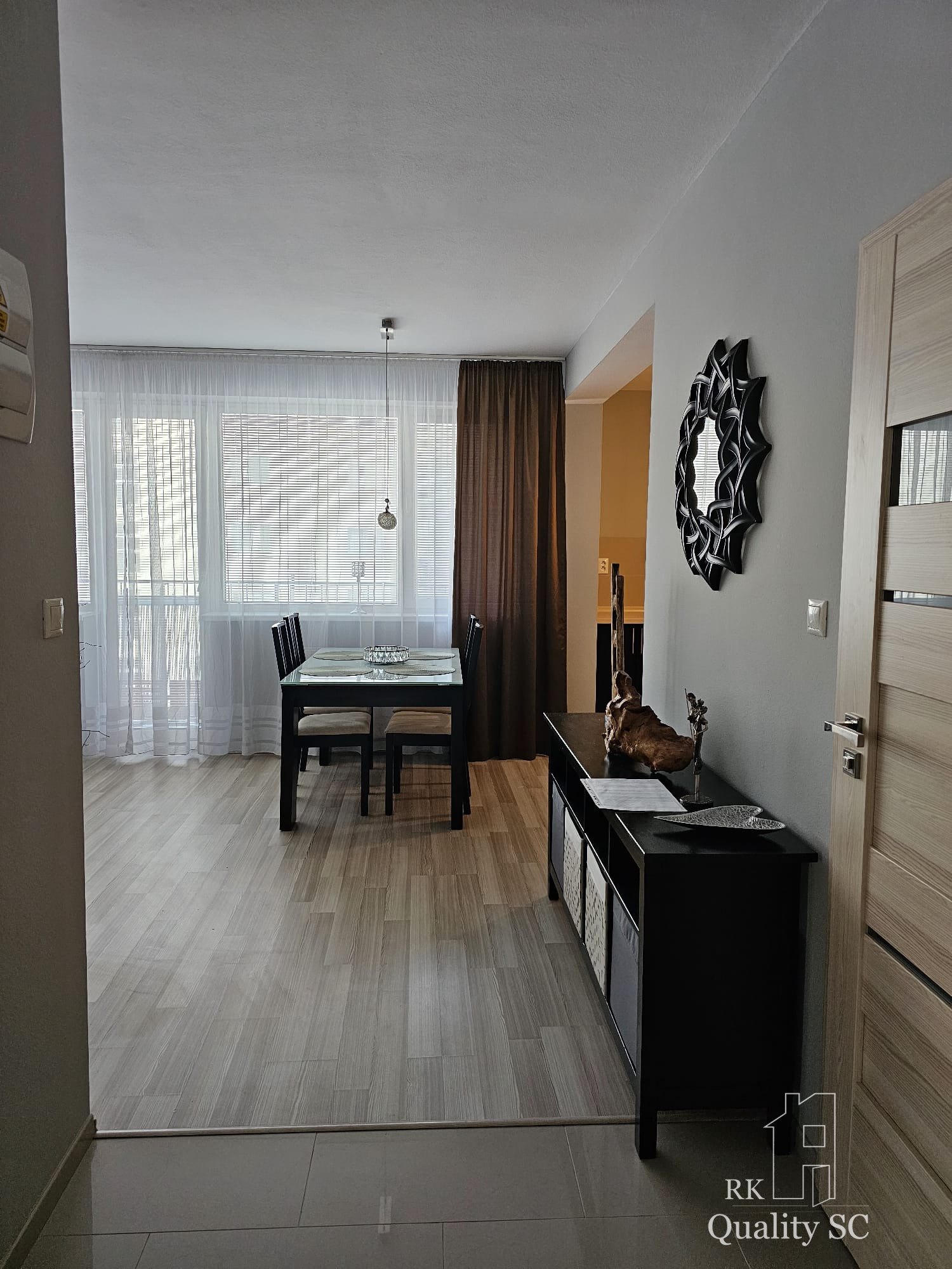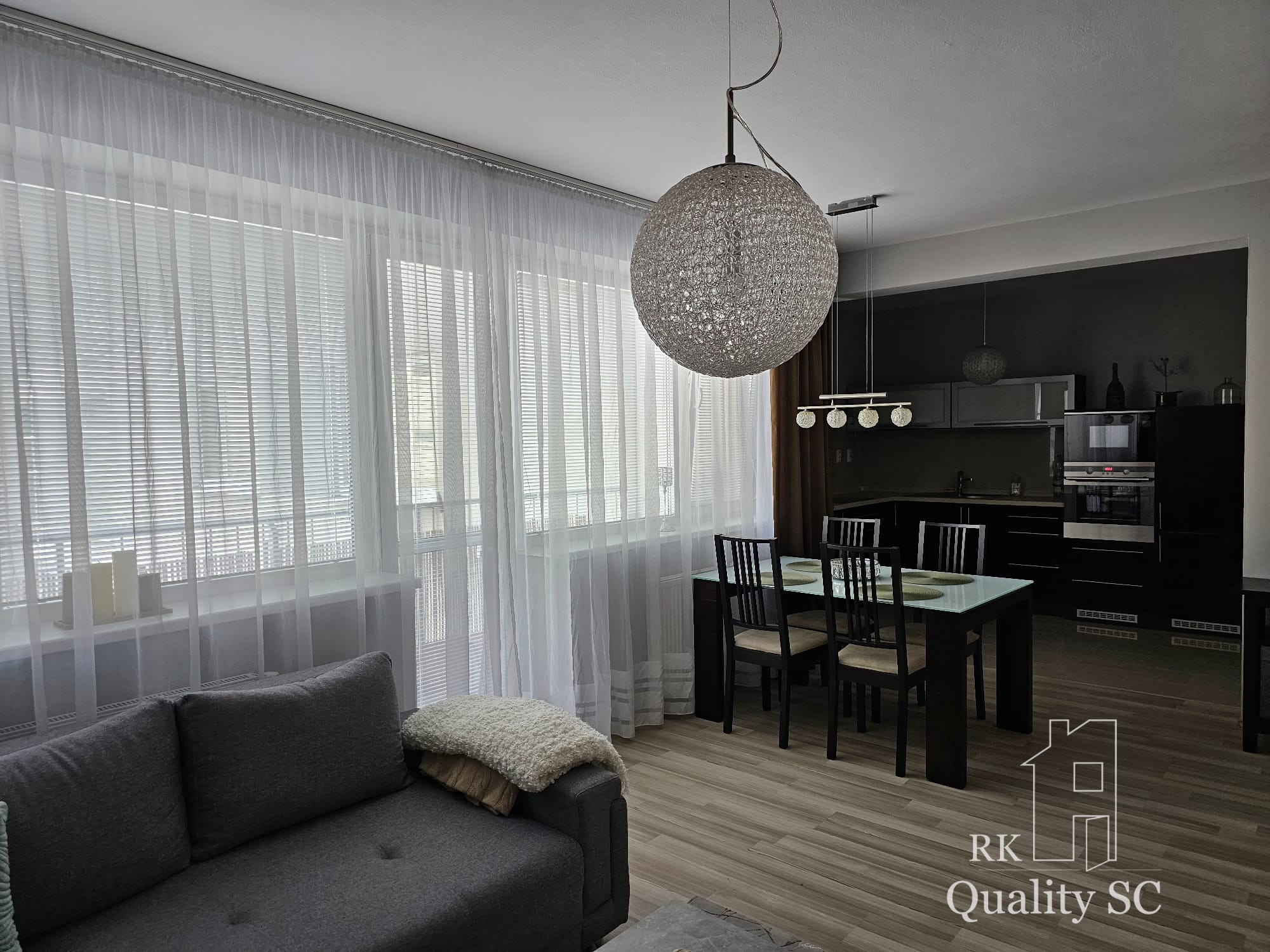 Popis bytu: vstupná chodba so vstavanou zrkadlovou rolldor skriňou, samostatná spálňa s manželskou posteľou + matrace , a vstavaná rolldor skriňa. Na chodbe komoda. Obývacia izba prepojená s kuchyňou. V obývacej časti je sedačka , komoda pod TV, Smart TV stolík, a závesná skrinka 2x. Vstup na loggiu je z obývacej izby . Na loggiu malý stolík + 2 stoličky. V kuchyni je kuchynská linka na mieru , sklo keramická varná doska , digestor, zabudovaná rúra, mikrovlnka , chladnička s mrazničkou. Kúpeľňa s vaňou a toaletou , práčka .