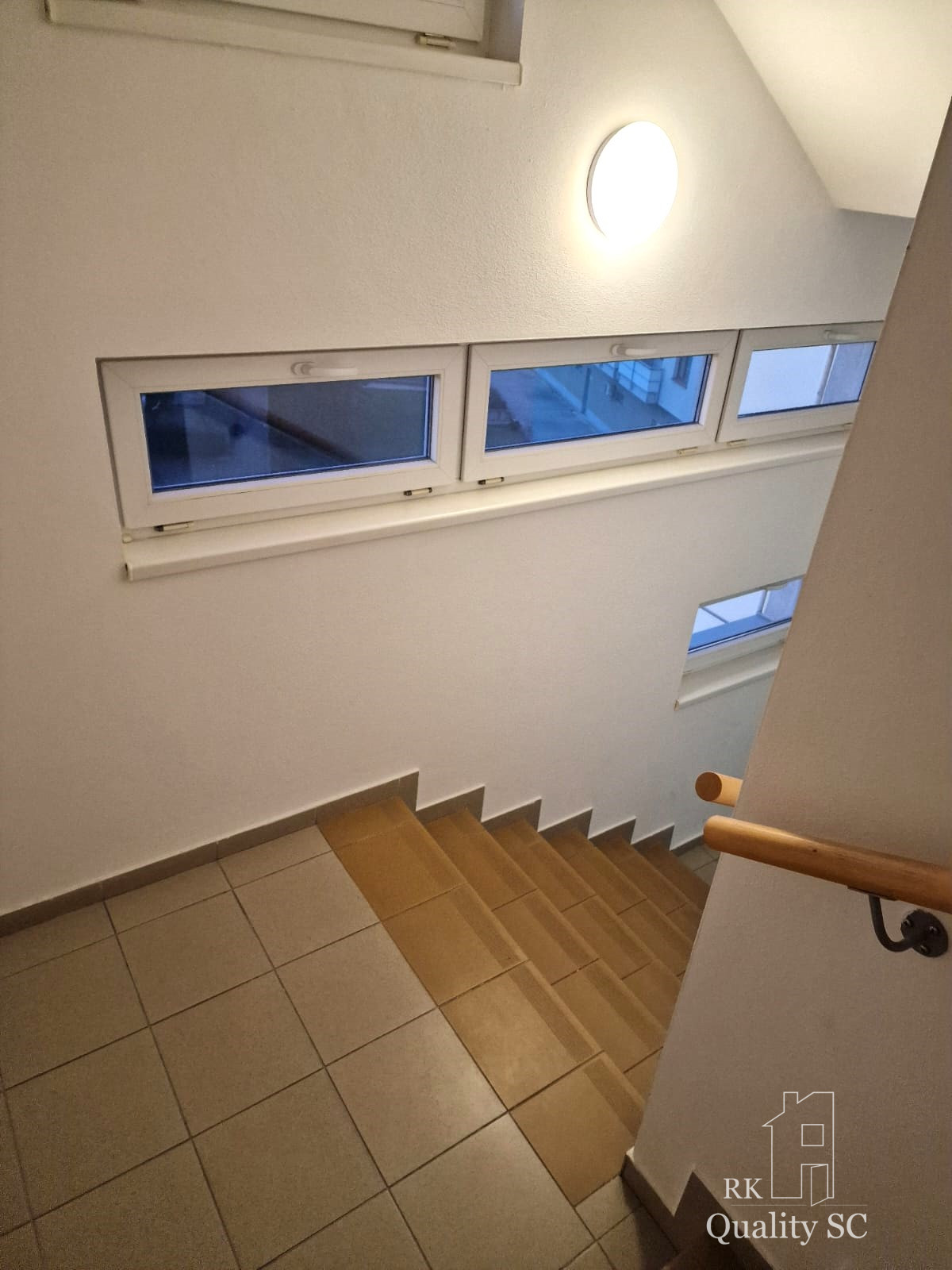 Z výťahu – schodiska vchádzate do samostatného uzamykateľného traktu s tromi bytmi . Vchod do samostatného bytového domu je zabezpečený video vrátnikom. Vo vestibule sa nachádzajú poštové schránky a kočikáreň, ktorá je k dispozícií pre všetkých obyvateľov vchodu. K bytu prináleží aj vlastná pivnica nachádzajúca sa na -1p. Mesačné náklady na bývanie sú aktuálne 180 €/2osoby ( správca + elektrika). Orientácia na svetové strany je juh aj keď východ slnka nad jazerom môžete pozorovať z balóna.