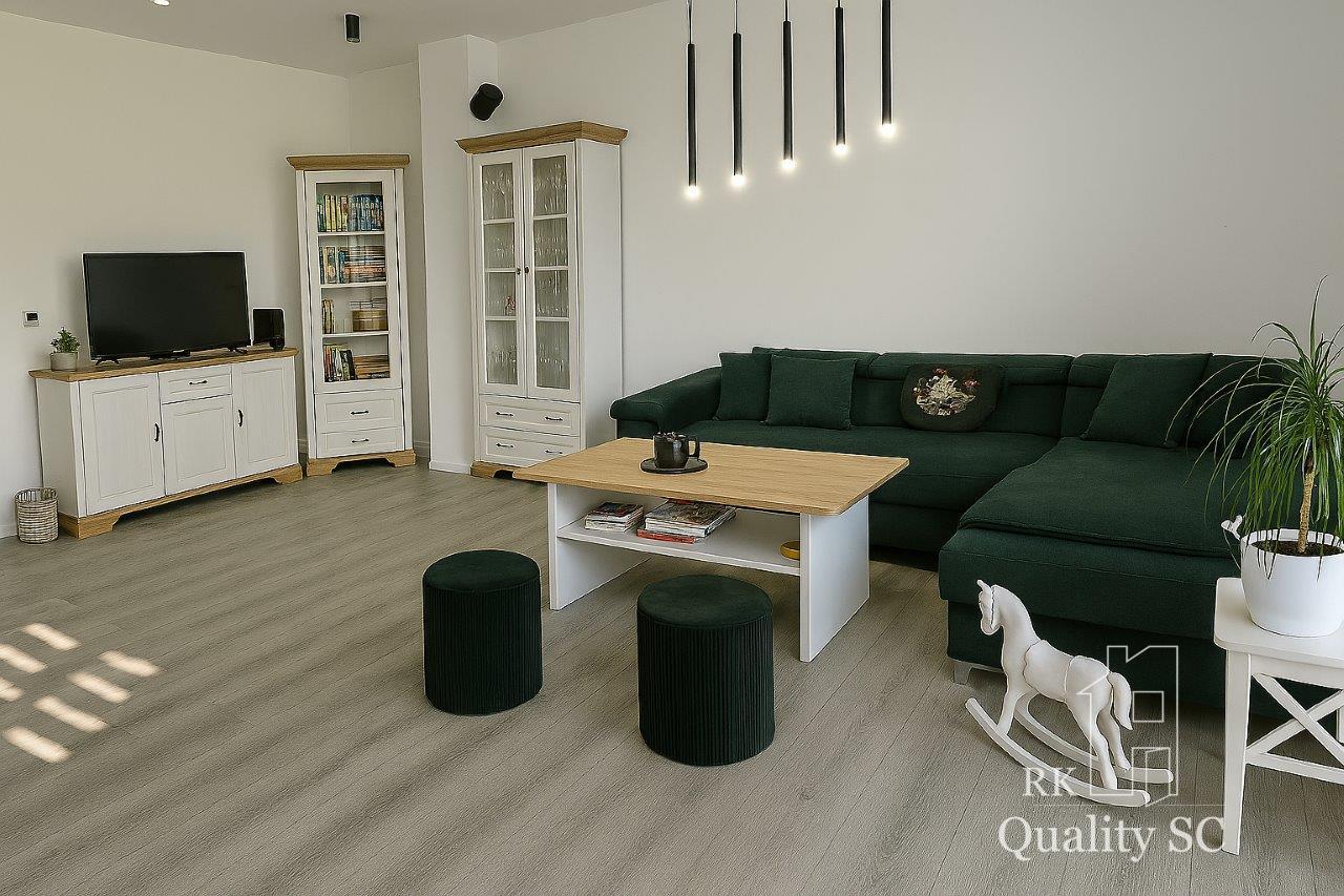 Dispozícia bytu: predsieň, po ľavej strane sú dve izby, samostatné WC, po pravej strane sa nachádza priestranná kúpeľňa s vaňou, technická miestnosť, prechod do jedálenskej časti s kuchyňou a priestrannou obývačkou, z ktorej sa vychádza na zastrešenú terasu (cca 21 m2). Dom je postavený z tehly, kompletne zateplený. Kúrenie elektrické podlahové. Predpríprava na klímu. K bytu prislúchajú dve parkovacie státia (vrámci pozemku) a jedno parkovacie státie vonku pred bránou.