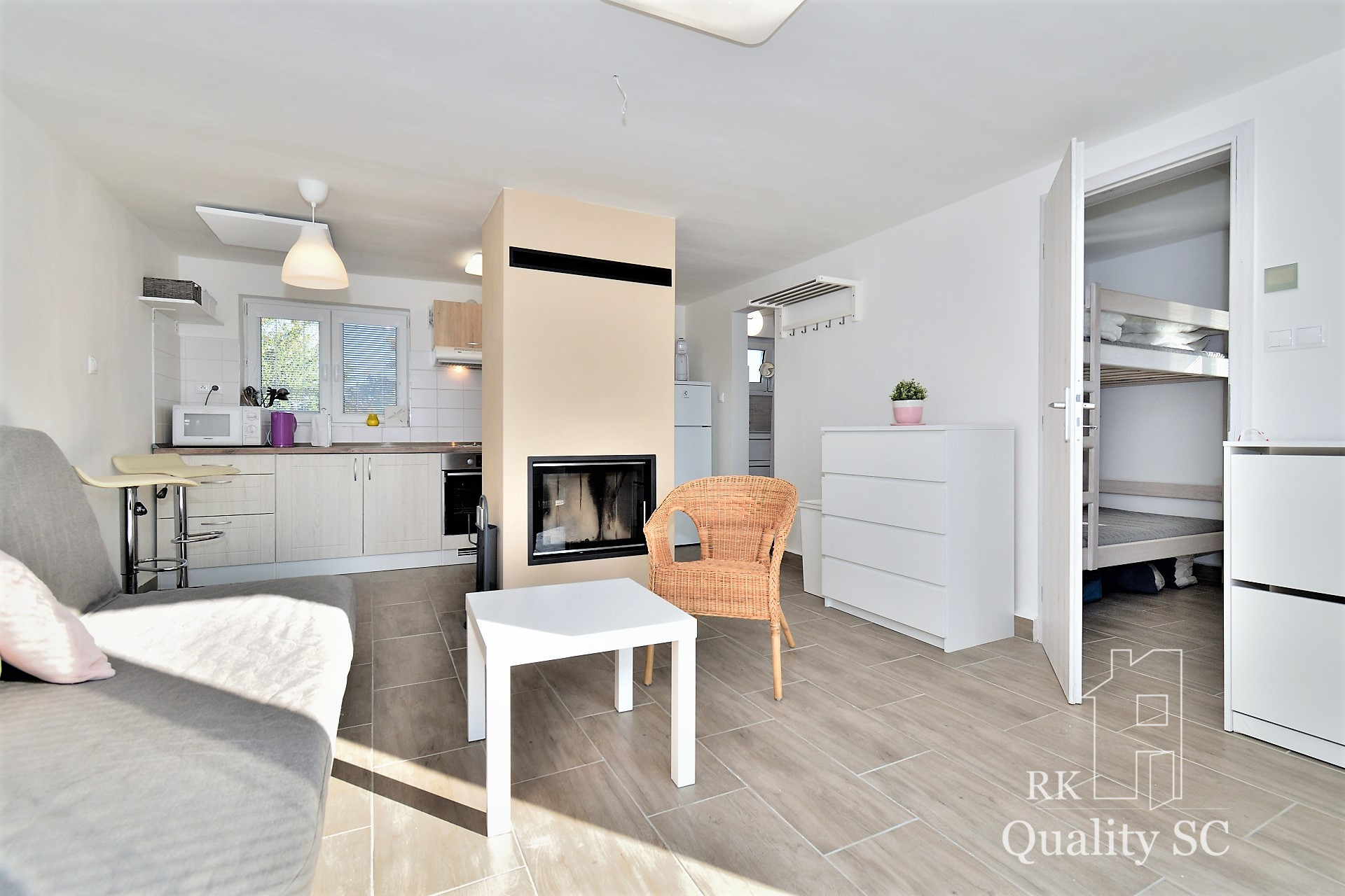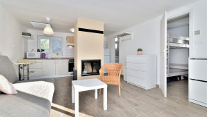 Vybavenie: V technickej miestnosti elektrický zásobník na ohrev teplej vody 100 l, práčka, pod schodmi sklad na drevo. V obývačke je kuchynská linka vybavená dresom, el. dvojplatničkou, el. rúrou, digestorom, mikrovlnnou rúrou, chladničkou s mrazničkou, sedačka, stena a štýlový krb. V spálni sú 2 poschodové postele a komoda. V kúpeľni sa nachádza sprchovací kút, umývadlo a WC.