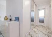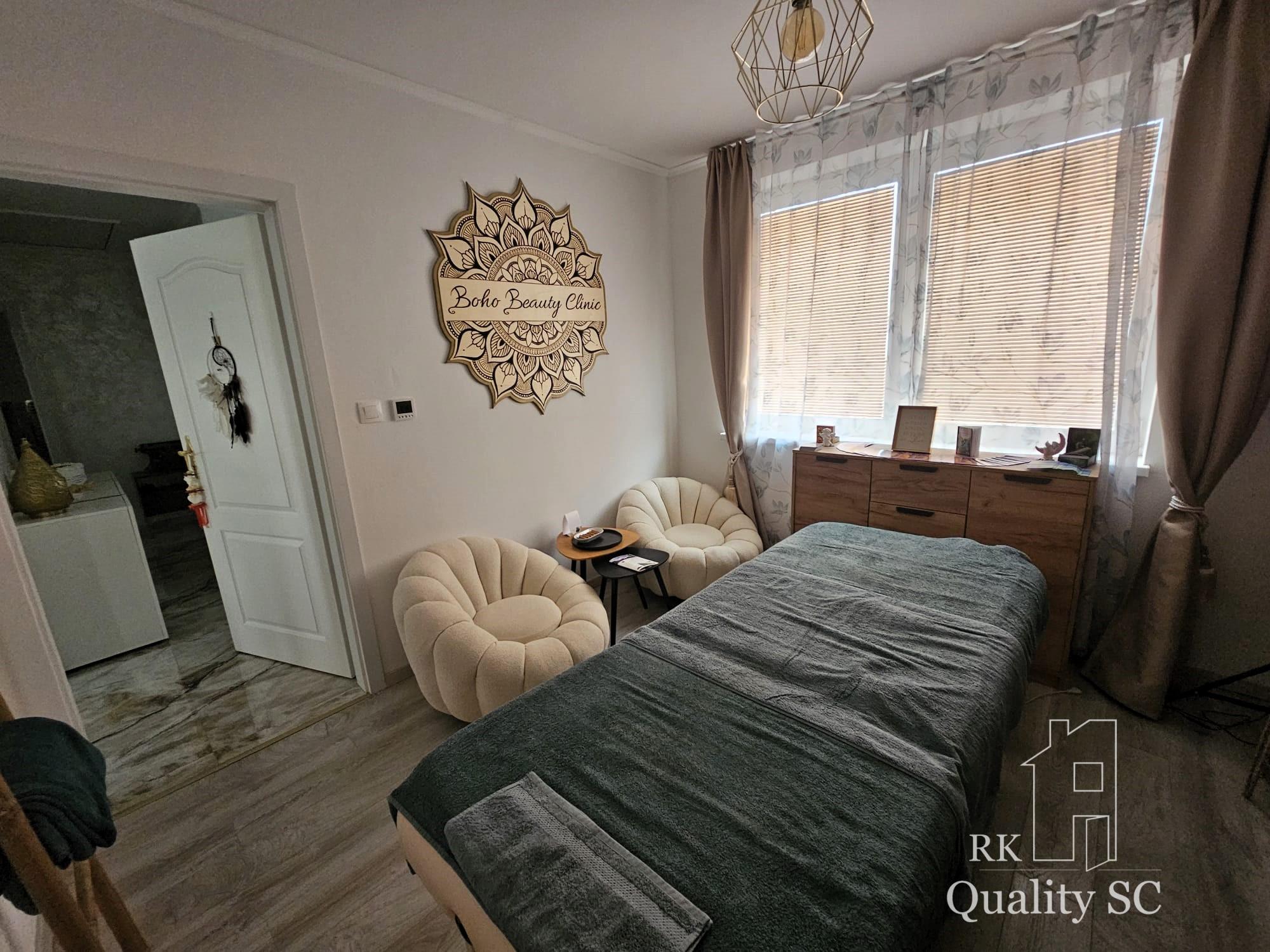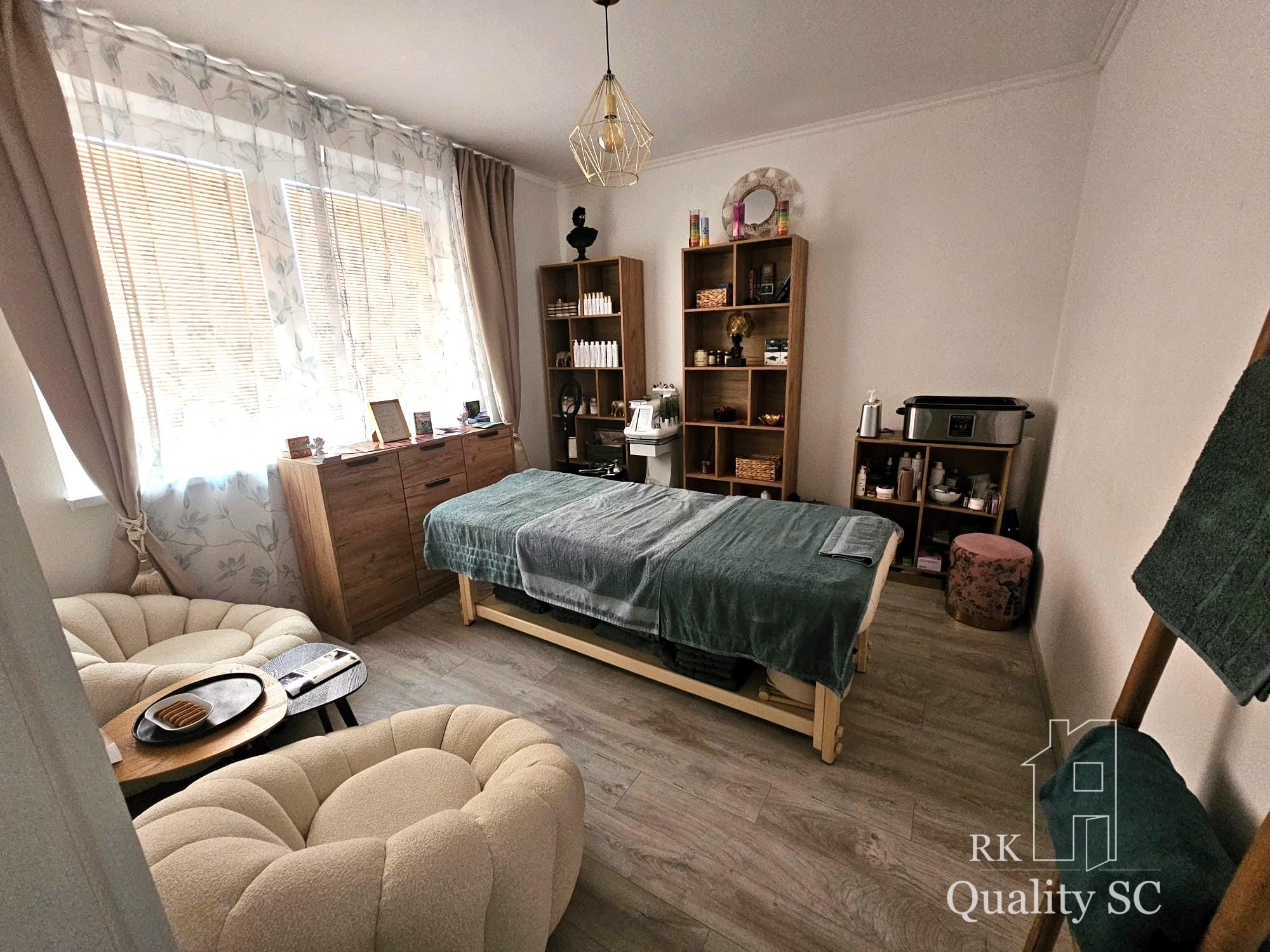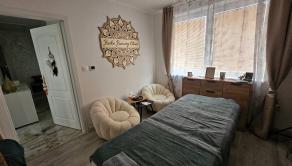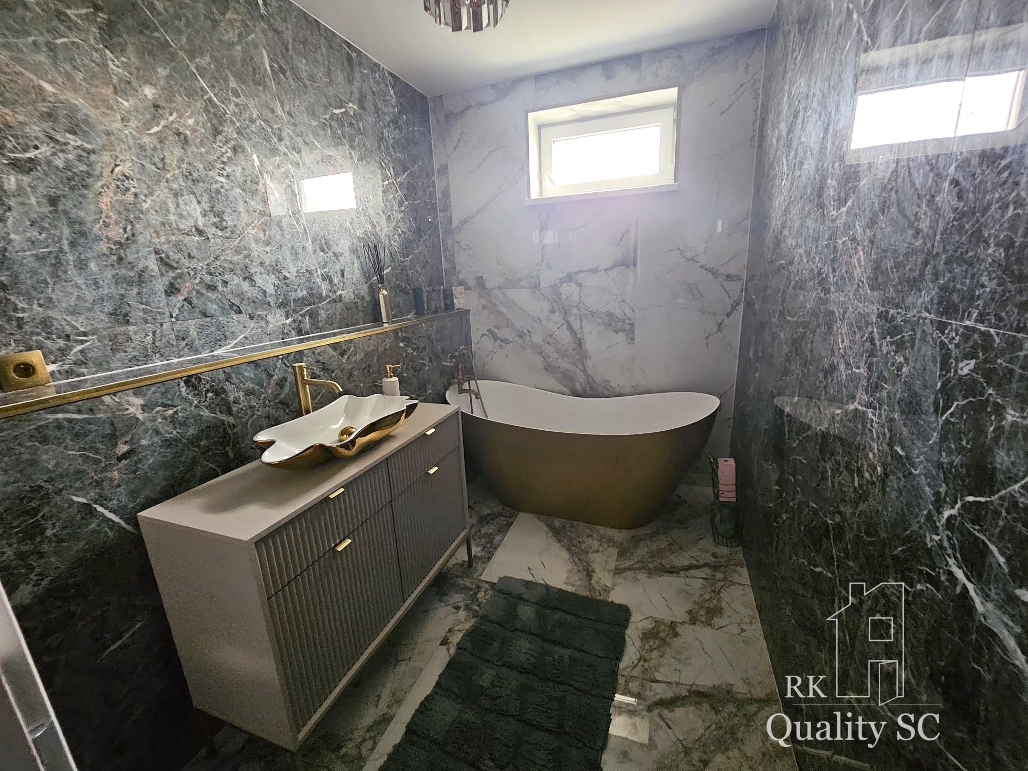 - vstup cez zádverie, po pravej strane kúpeľňa s toaletou a sprchovým kútom. V kúpeľni sa nachádza aj kotol so 120l zásobníkom vody. Po ľavej strane samostatná izba. Oproti vstup do kuchyne, spojenej s obývacou izbou. Zádverie pokračuje chodbou, z ktorej sa vchádza do ďalších dvoch samostatných izieb a kúpeľne s voľne stojacou vaňou a toaletou. Na chodbe sa nachádza veľká vstavaná skriňa. Vstup na povalu, ktorá slúži len ako odkladací priestor. V dome sú použité nadštandardné materiály na obklady, dlažbu a podlahy v izbách. Steny sú upravené modernou talianskou stierkou, čo priestoru dodáva elegantný a luxusný vzhľad. Kúrenie je elektrické podlahové s digitálnou reguláciou teploty v každej miestnosti. IS- elektrina, mestská voda, žumpa, optika. Orientácia na svetové strany Z/V.