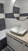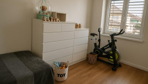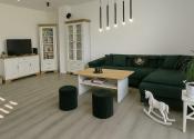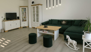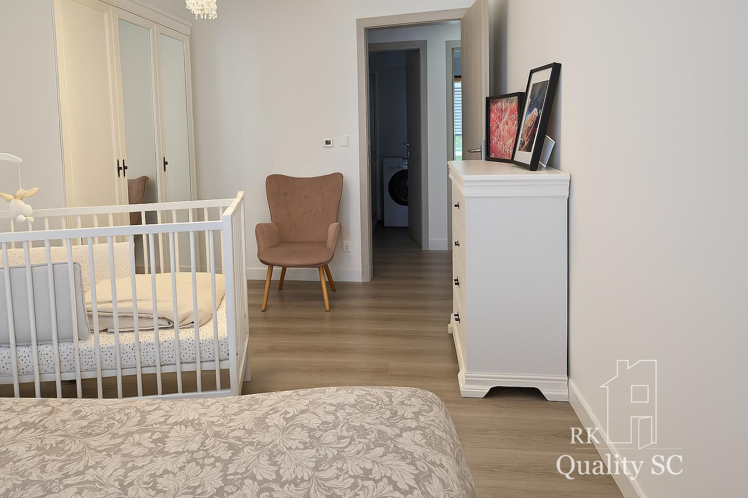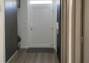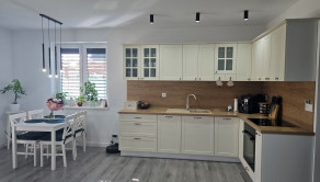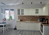 Dispozícia bytu: predsieň, po ľavej strane sú dve izby, samostatné WC, po pravej strane sa nachádza priestranná kúpeľňa s vaňou, technická miestnosť, prechod do jedálenskej časti s kuchyňou a priestrannou obývačkou, z ktorej sa vychádza na zastrešenú terasu (cca 21 m2). Dom je postavený z tehly, kompletne zateplený. Kúrenie elektrické podlahové. Predpríprava na klímu. K bytu prislúchajú dve parkovacie státia (vrámci pozemku) a jedno parkovacie státie vonku pred bránou.