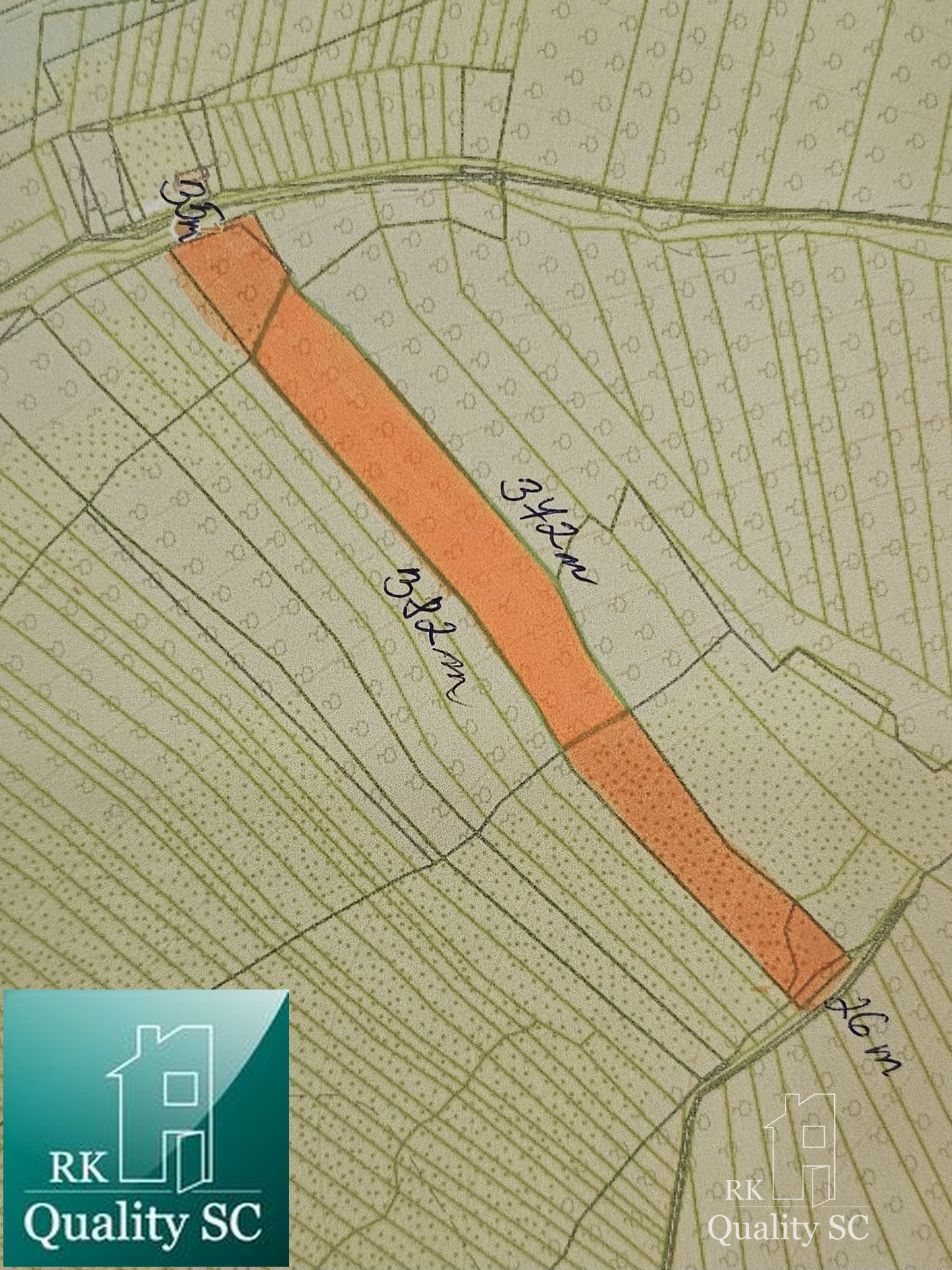 Pozemok má príjemné rozmery – jeho dĺžka dosahuje približne 372 m na jednej strane a 382 m na druhej, pričom šírka sa pohybuje od cca 36 m v spodnej časti po cca 26 m v hornej. Terén je prirodzene členitý – spodná aj horná časť sú rovinaté, stredná časť je svahovitá s prevýšením približne 87 metrov, čo dodáva miestu jedinečný charakter a výhľady.