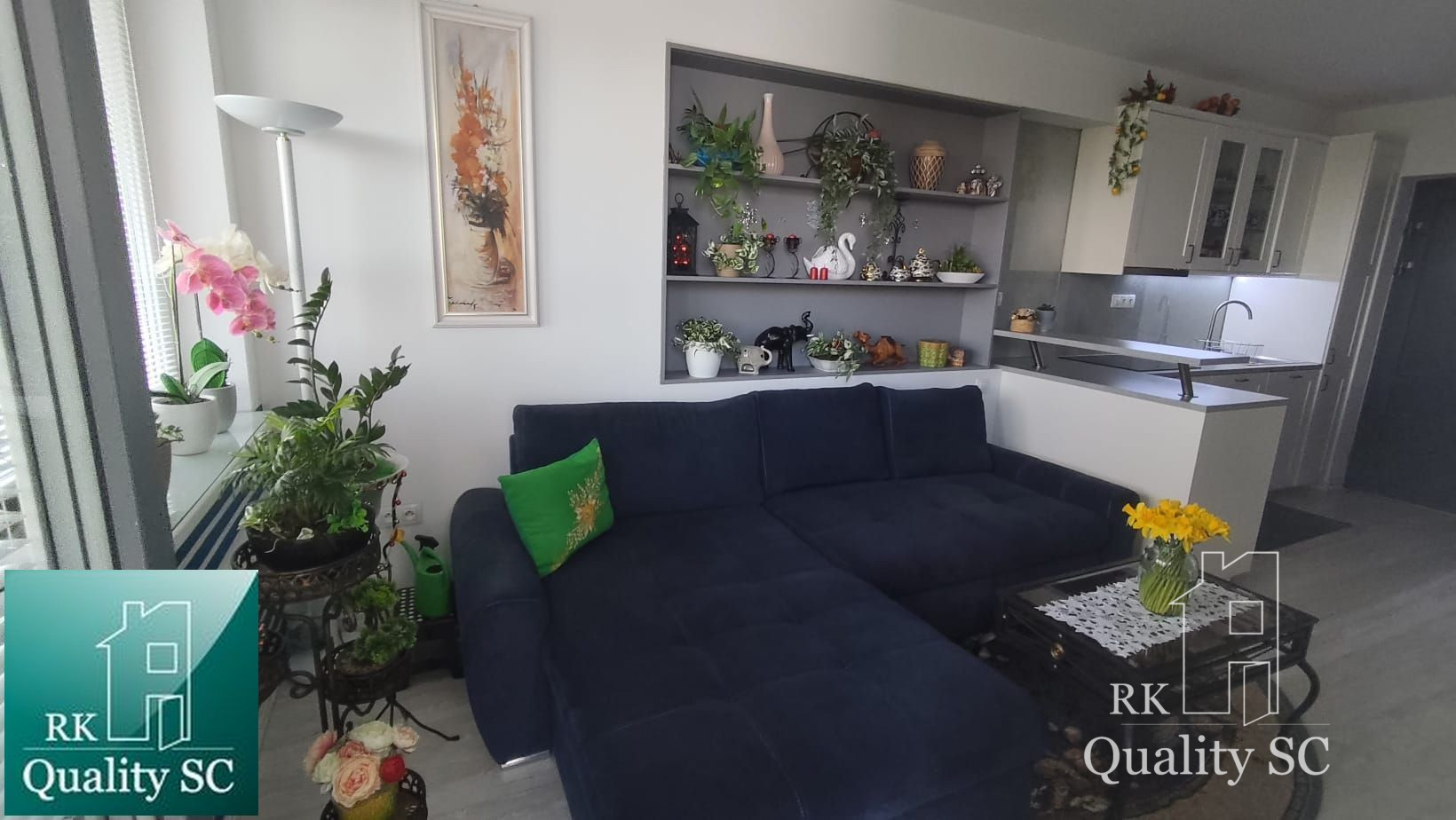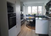 - po pravej strane sa nachádza kuchynská časť s priestrannou kuchynskou linkou, barovým pultom na predelenie kuchynskej časti od obývacej,