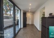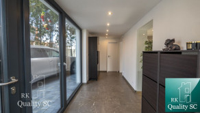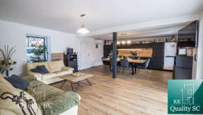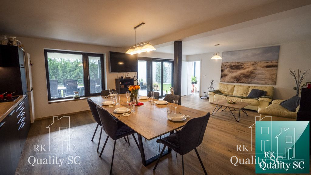 Dispozícia: Prízemie vstupné presklenné zádverie, z neho vstup do kúpeľne spoločne s WC a do veľkorysej obývačky, ktorá zaberá celé prízemie. Je vybavená kuchynským kútom a jedálenským priestorom, ktorý nadväzuje na obývačkovú časť vybavenú koženou dvoj sedačkou. Kuchynská linka je kompletne vybavená kvalitnými elektrospotrebičmi – el. varná doska, el. rúra, digestor, chladnička s mrazničkou, mikrovlnka a umývačka riadu. Z obývačky je vstup na priestrannú vydláždenú terasu 32 m2 s elektricky ovládaným prestrešením.