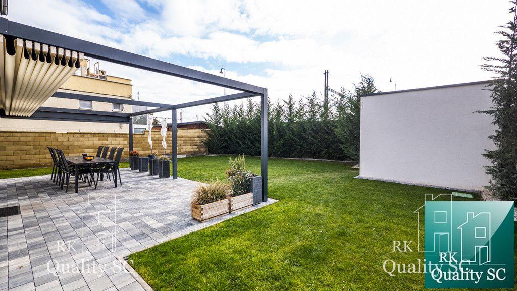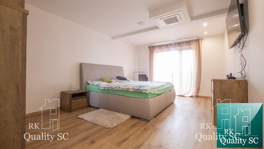 Dispozícia: Prízemie vstupné presklenné zádverie, z neho vstup do kúpeľne spoločne s WC a do veľkorysej obývačky, ktorá zaberá celé prízemie. Je vybavená kuchynským kútom a jedálenským priestorom, ktorý nadväzuje na obývačkovú časť vybavenú koženou dvoj sedačkou. Kuchynská linka je kompletne vybavená kvalitnými elektrospotrebičmi – el. varná doska, el. rúra, digestor, chladnička s mrazničkou, mikrovlnka a umývačka riadu. Z obývačky je vstup na priestrannú vydláždenú terasu 32 m2 s elektricky ovládaným prestrešením.
