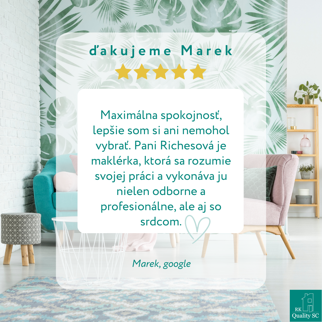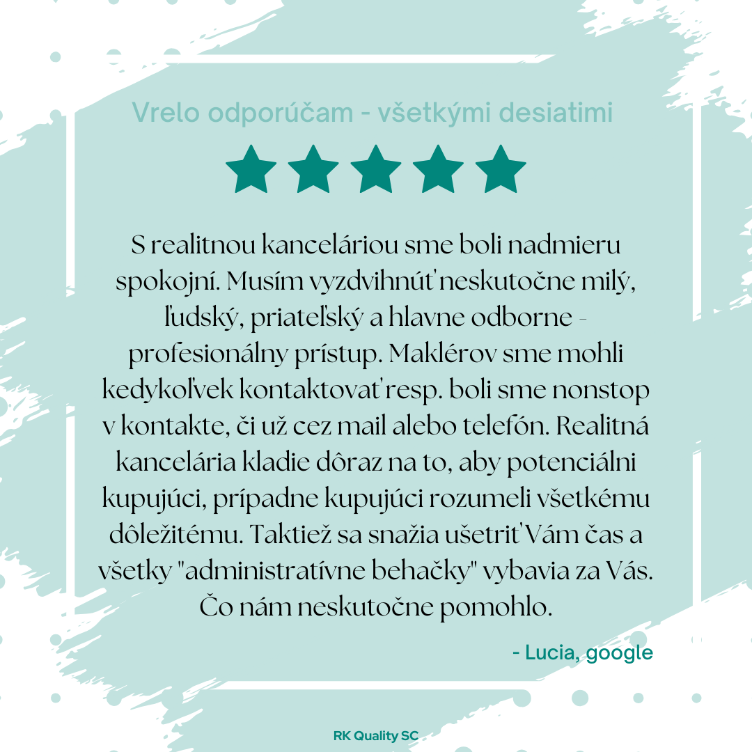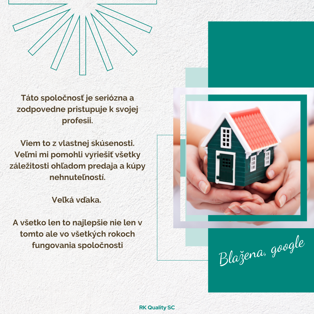 "Vyjadrujem spokojnosť nad predajom rodinného domu realitnej kancelárie RK Quality SC, s.r.o. v zastúpení p. Kášu. K predaju našej nehnuteľnosti pristupoval precízne a so znalosťou makléra s maximálnou inteligenciou. Ďakujeme a prajeme veľa úspechov v ďalšej práci."