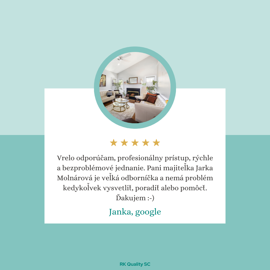 "Výborne, 100% spokojnosť s RK Quality SC. Ďakujeme p. Molnárovej a hlavne S. Poórovej. Profesionalita a ochota. Odporúčame."