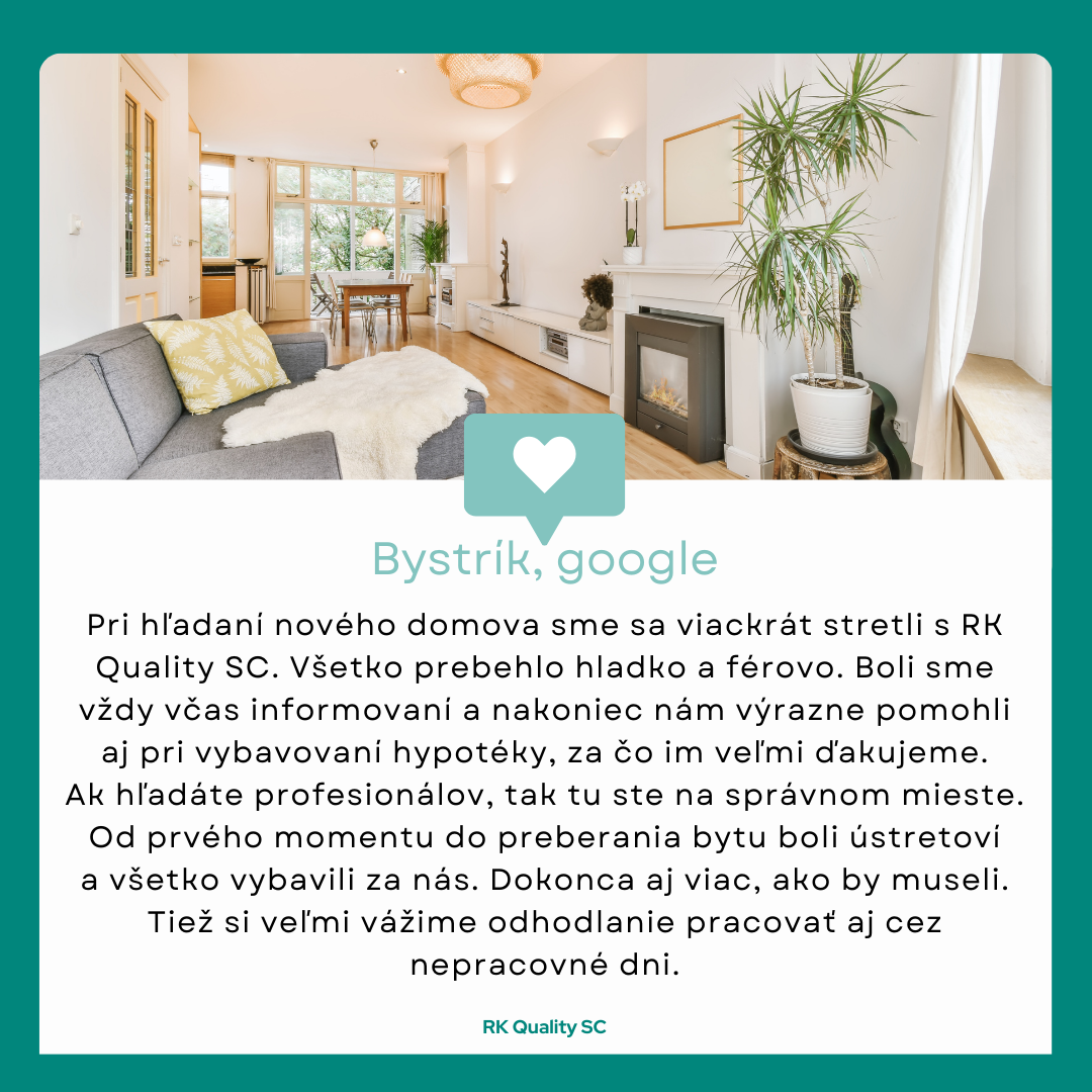 "Vďaka Quality SC sme našli to najlepšie bývanie v Senci pre nás. Skvelá spolupráca, komunikácia a hlavne rýchlosť. Sme maximálne spokojní a v budúcnosti určite využijeme znova vaše služby. Veľké ďakujem obzvlásť patrí pani Valenskej za jej ochotu, obhliadky v neskorých hodinách a hlavne snahu vyhovieť našim nie zrovna najjednoduchším požiadavkám. Ďakujeme a želáme veľa spokojných zákazníkov."