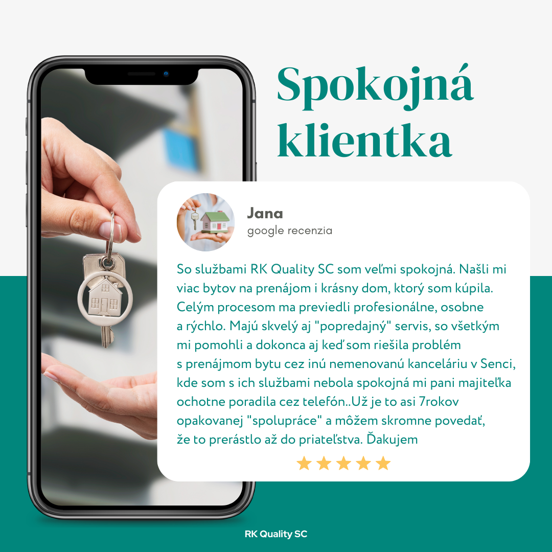 "Chcem sa velmi pekne podakovat RK QUALITY SC za pomoc pri kupe novostavby v Senci. Pani Molnarova a pan Ing.Kaša odviedli skvelu pracu, boli velmi ochotni,poradili,obhliadku prisposobili mojmu volnemu casu,terminy vzdy dodrzali, potrebne papiere, dotiahli do konca k mojej spokojnosti,velmi vyzdvihujem komunikaciu a spolupracu.Ak by som riesila byvanie,bez vahania by som znovu vyuzila ich sluzby. Zelam vsetko dobre a este raz dakujem."
